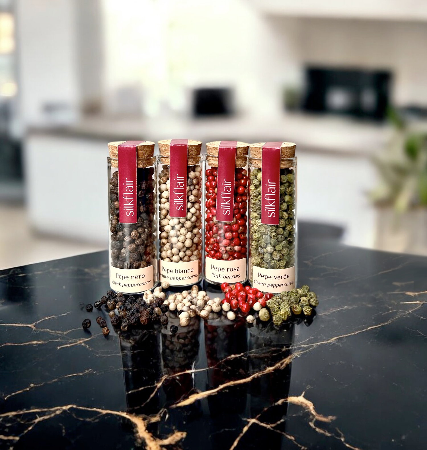 Un quartetto di pepi, ciascuno con una storia da raccontare, raccolti con cura e selezionati per chi sa apprezzare i dettagli. Questo set, composto da pepe bianco, pepe nero di Ceylon, pepe rosa e pepe verde, rappresenta un raffinato equilibrio tra tradizione e scoperta.